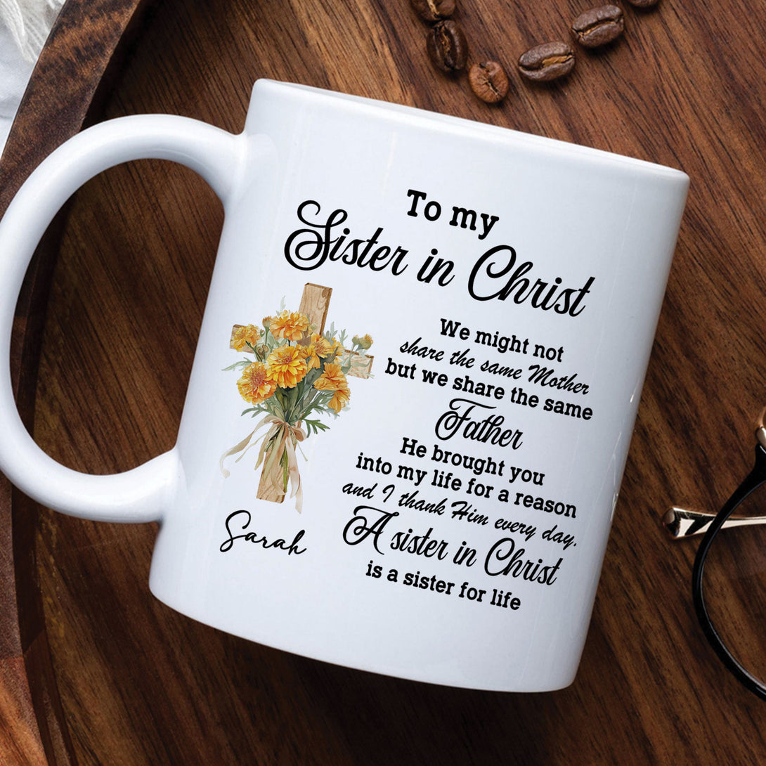 A Sister In Christ Is A Sister For Life Personalized White Mug, Custom Name and Birth Month Flowers