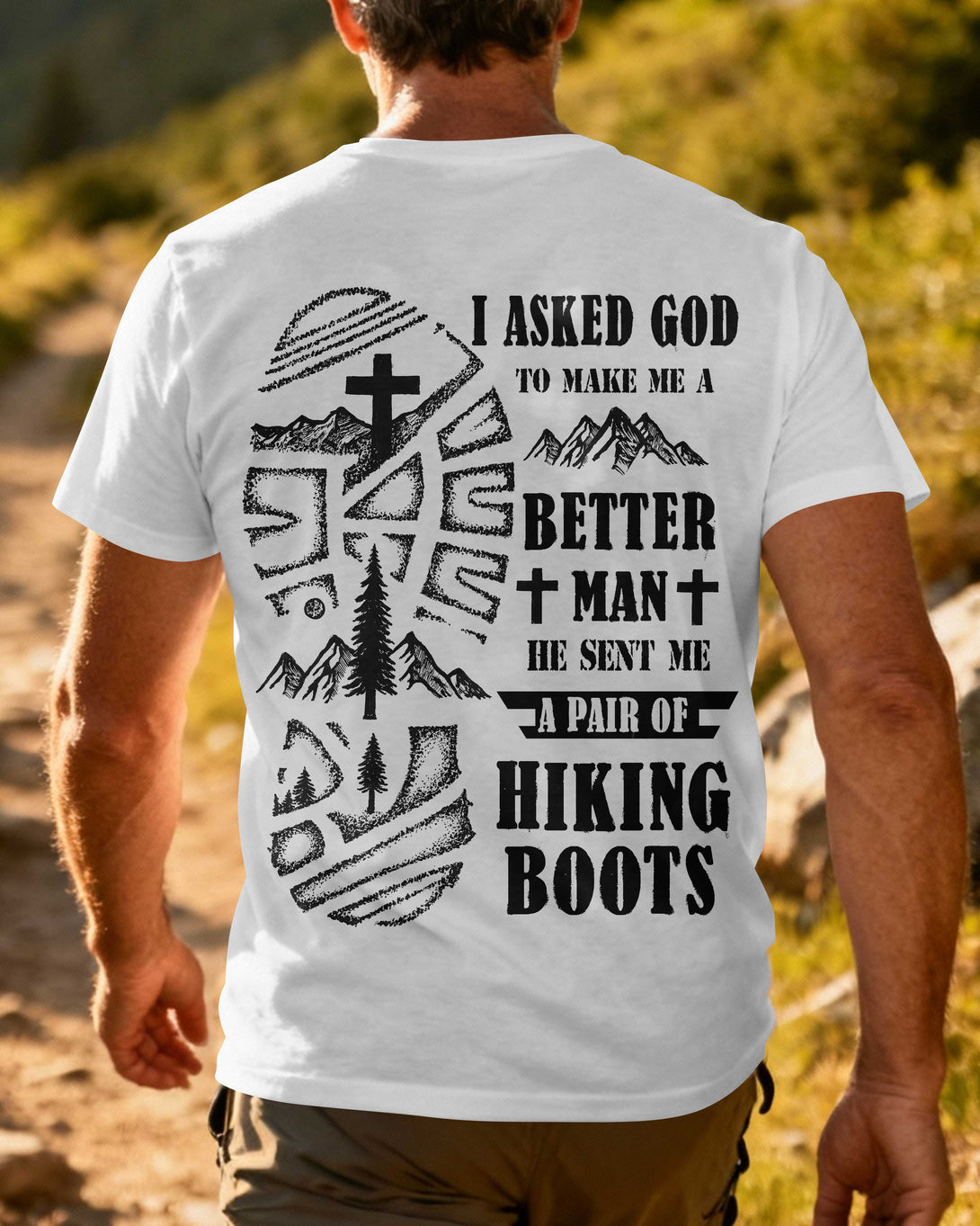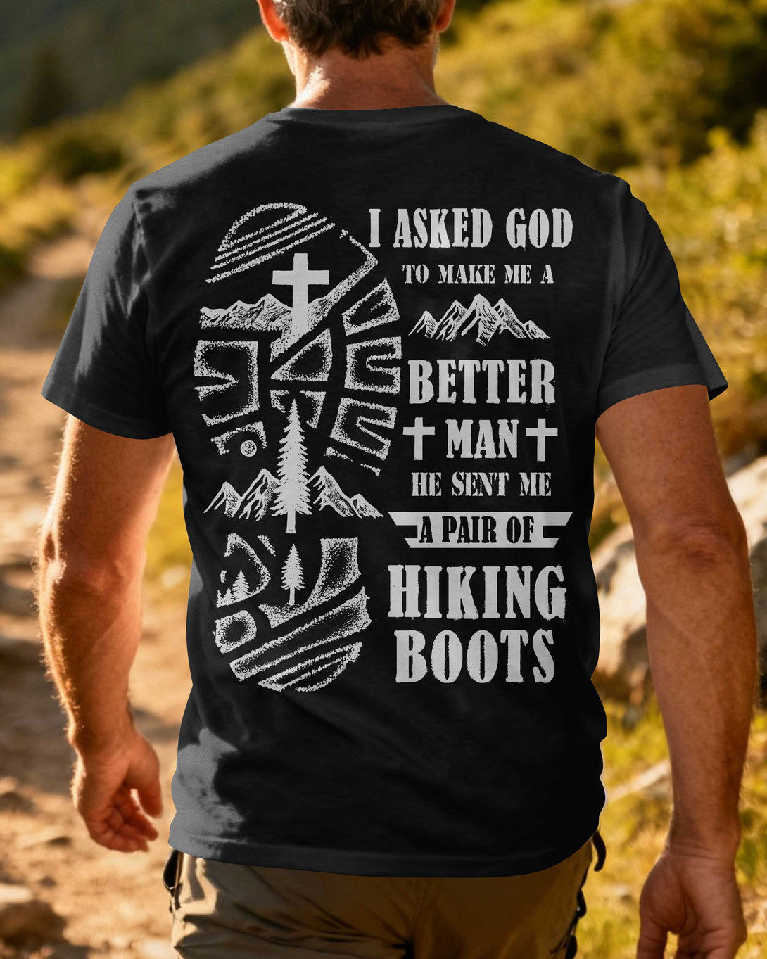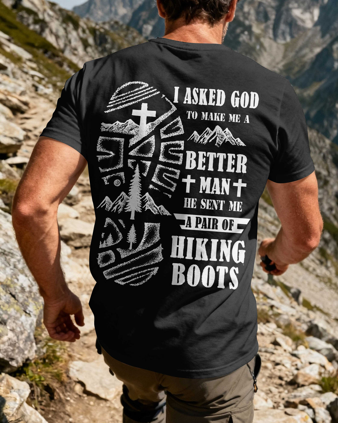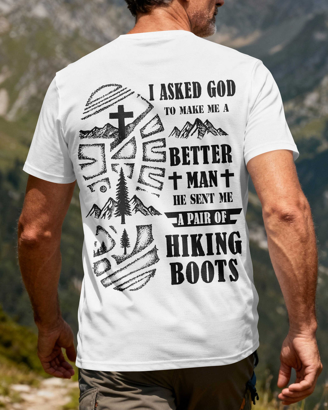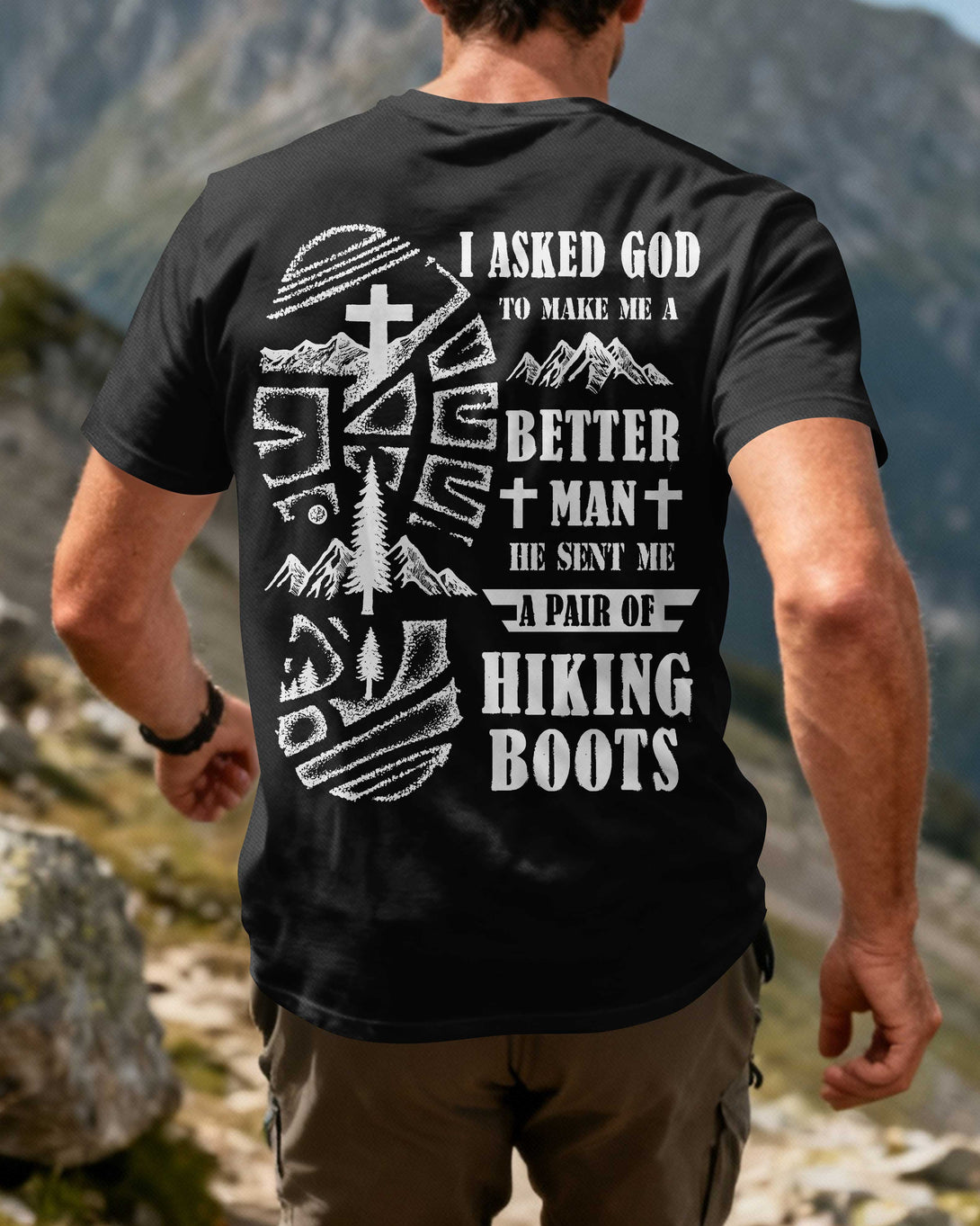 I Asked God To Make Me A Better Man He Sent Me A Pair Of Hiking Boots T-Shirt