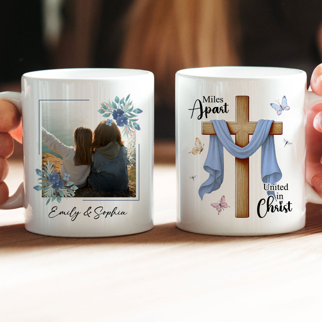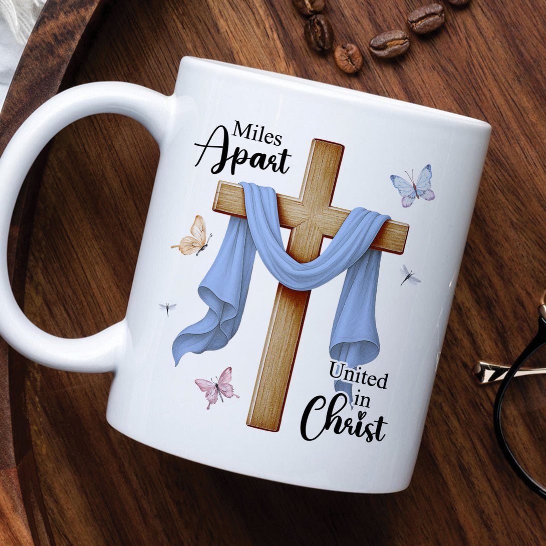 Miles Apart United In Christ Personalized White Mug, Custom Friends Name