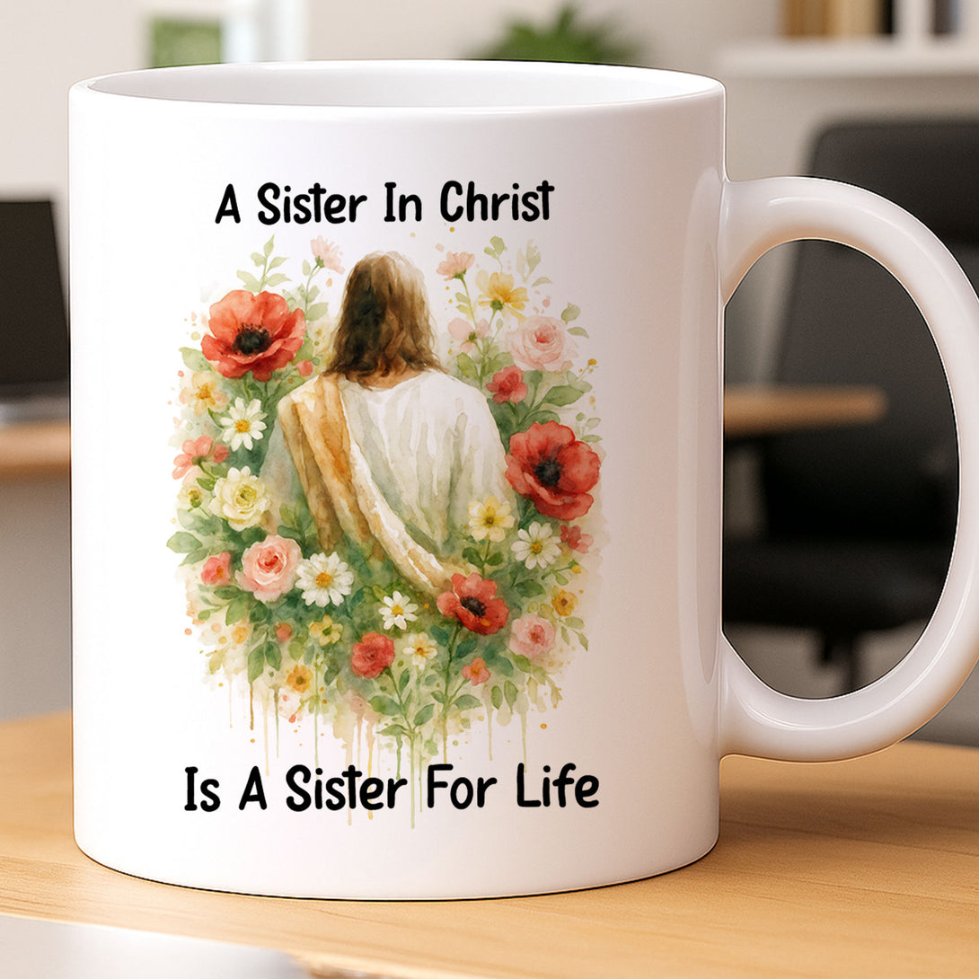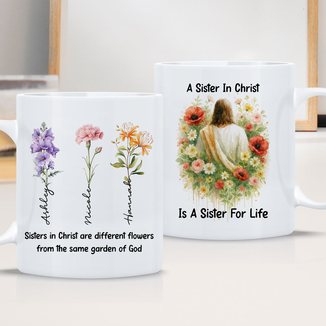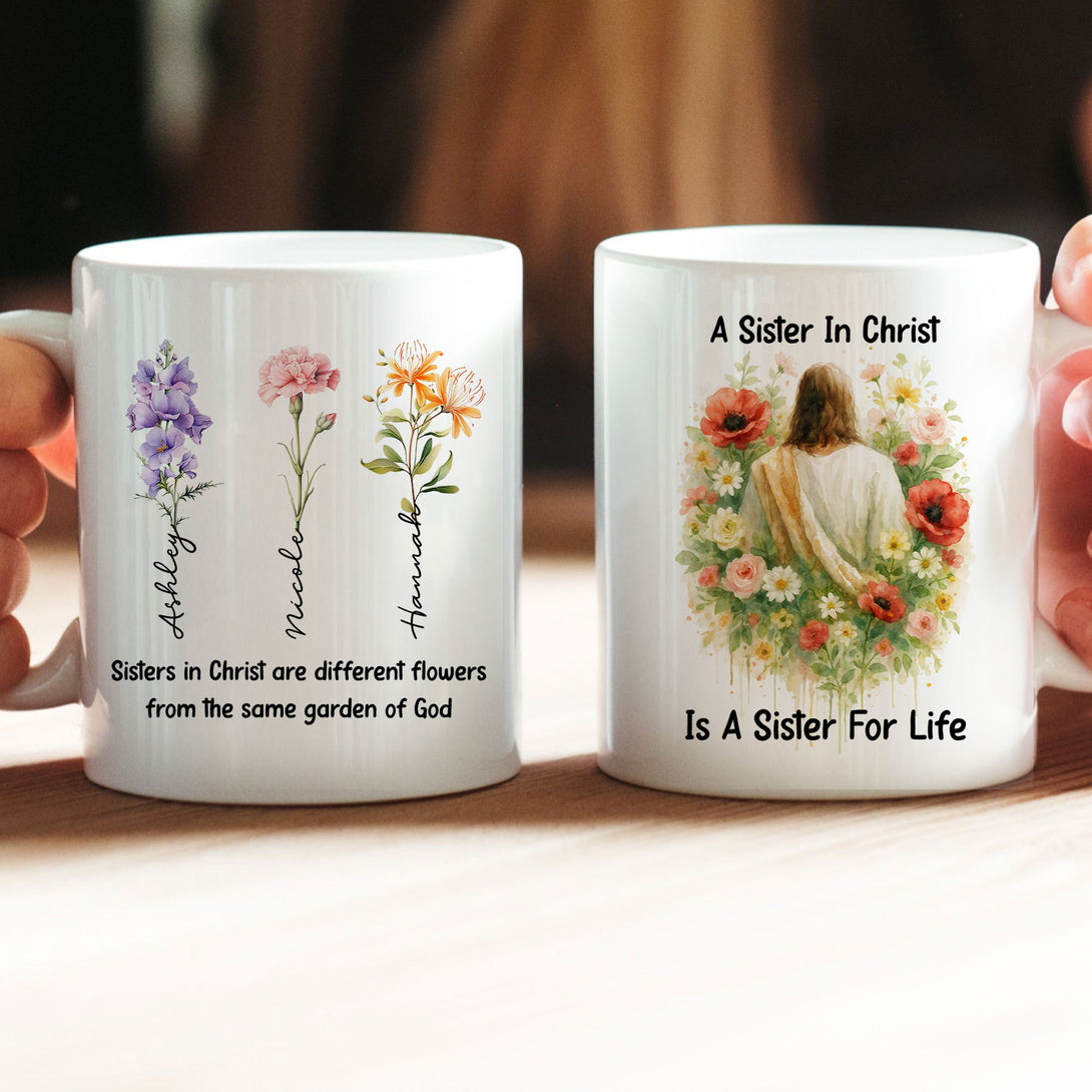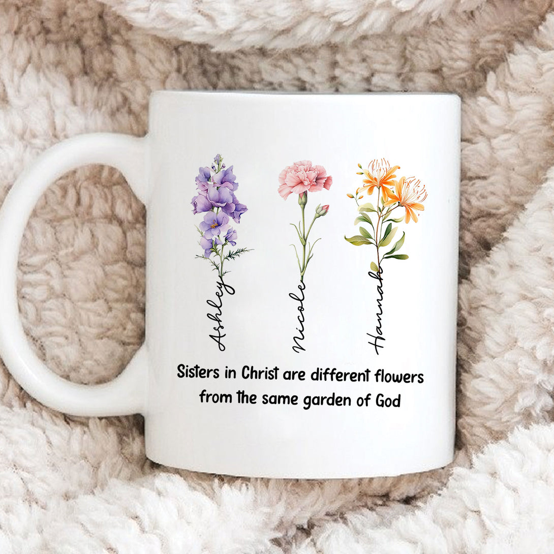 Sisters From The Same Garden of God Personalized White Mug, Custom Name and Birth Month Flowers